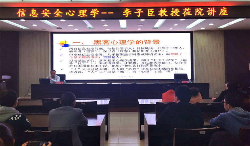 10月18日下午,为庆祝河南理工大学建校110周年以及yl6809永利官网建院20周年,我院特聘教授北京印刷学院李子臣教授莅院,在201会议室作了一场题为《信息安全心理学》的学术报告,学院部分教师和全体研究生聆听了报告,报告会由副院长于金霞主持。