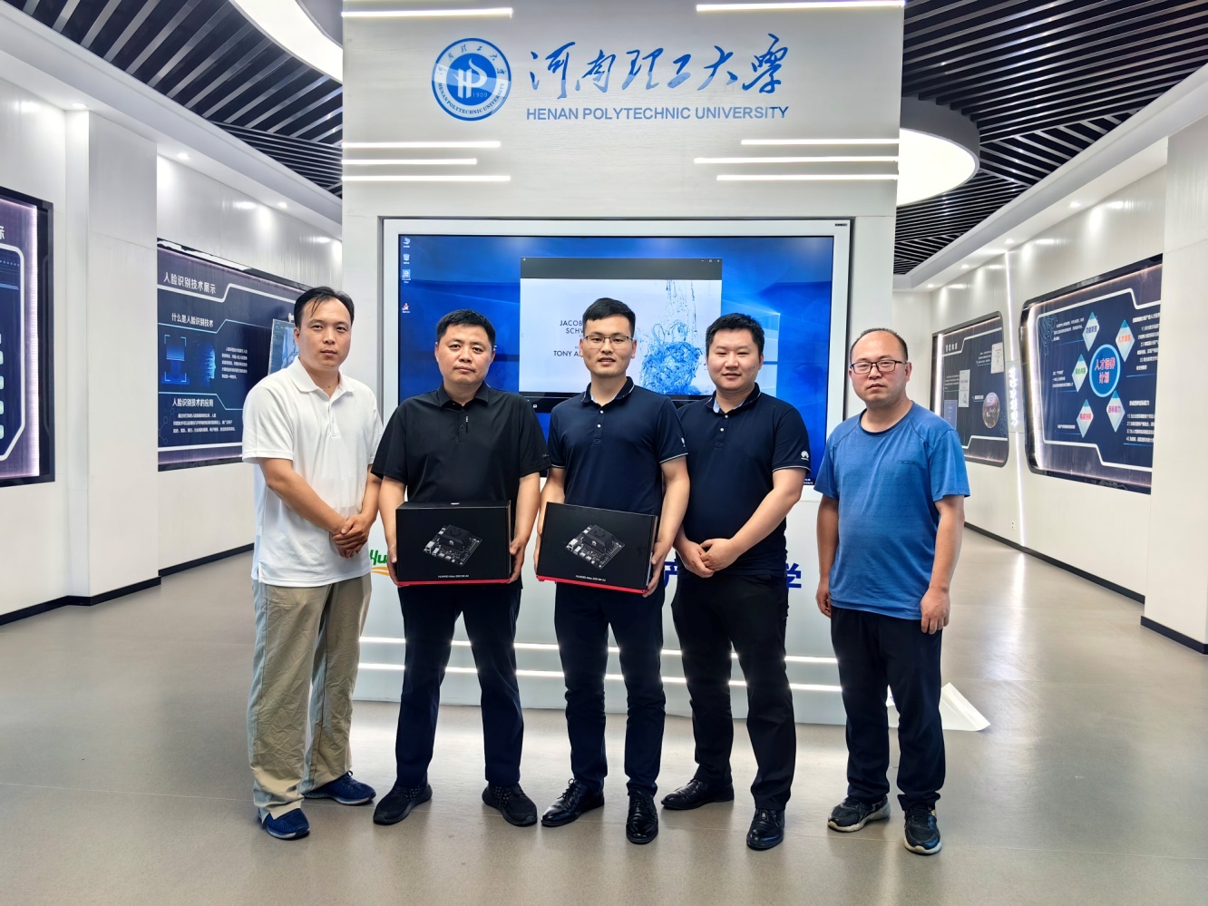 中原人工智能计算中心由许昌市政府与华为公司共同建设,致力于推动人工智能产业在河南省的推广和行业应用。计算中心教育生态负责人孙星星和技术专家刘贤阁在yl6809永利官网2楼鲲鹏展厅,向学院赠送两套华为新开发的昇腾新一代Atlas 200I DK A2开发者套件,支持学院进行人工智能人才培养和学科竞赛。