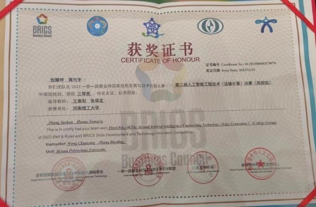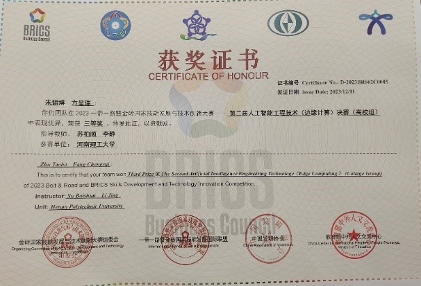 12月11日,2023一带一路暨金砖国家技能发展与技术创新大赛第二届人工智能工程技术(边缘计算)决赛在上海信息管理学校落下帷幕。经过精心准备,yl6809永利官网苏柏顺、李静、王春阳和张保定老师指导的本科生朱韬博、方呈瑞、张耀坤、黄向宇分别获得第二届人工智能工程技术(边缘计算)决赛(高校组)三等奖。
