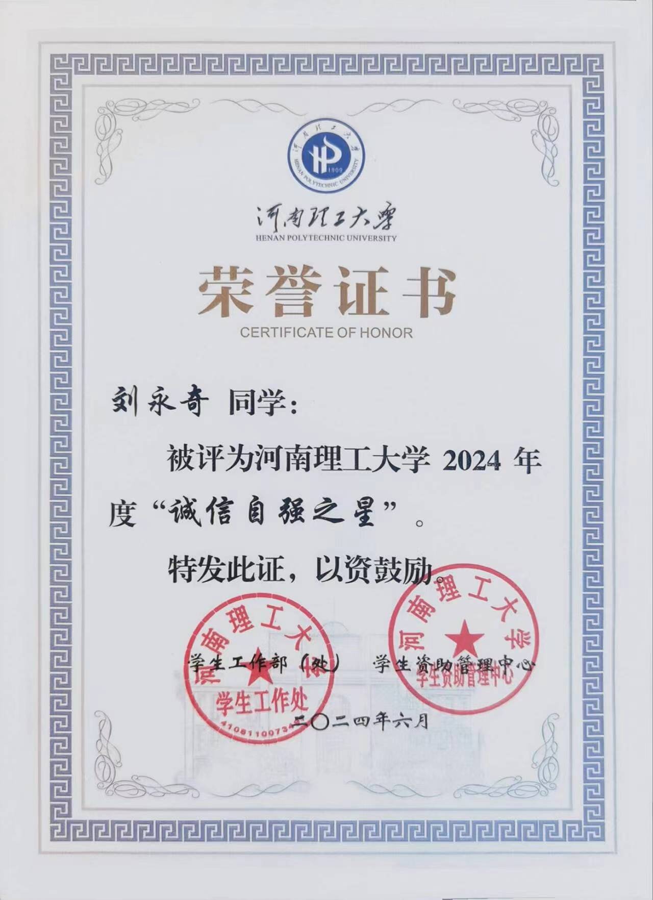 为增强大学生的诚信意识和责任意识,弘扬诚实守信、自强自立、感恩奉献的优良品质,鼓励受助学生励志成才、诚信还贷,近期,学校组织开展了2024年度“诚信自强之星”评选活动。我院2020级软件工程专业本科生刘永奇获得河南理工大学2024年度“诚信自强之星”称号。