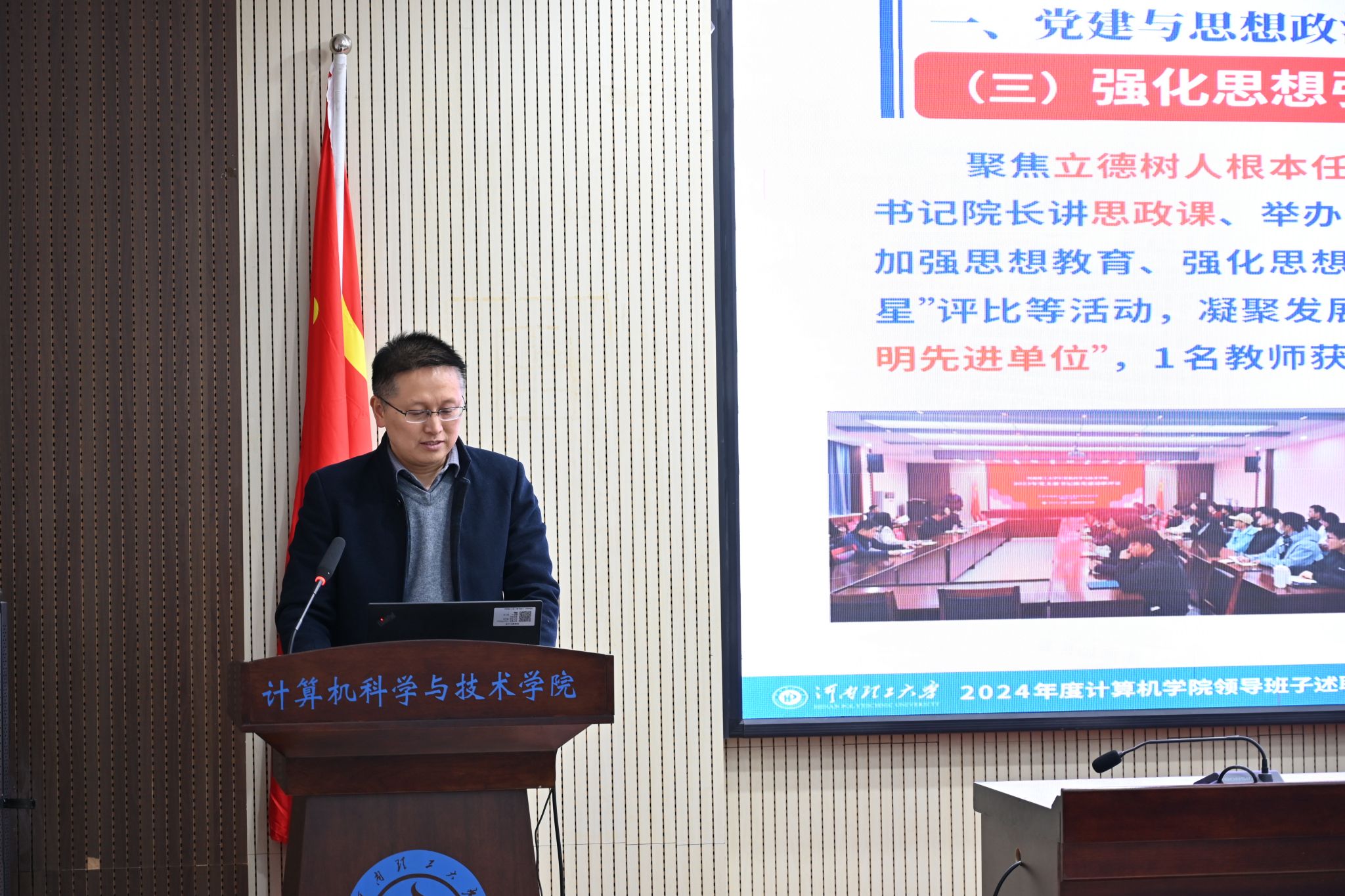 院长孙君顶代表学院党政领导班子作述职述廉述学报告。他从党建和思想政治工作、学院各项事业发展、下一步发展思路三个方面对学院2024年的工作进行了系统汇报,总结了在全院师生共同努力下所作出的成绩以及工作中存在的问题与不足,并提出了2025年的发展思路。述职报告后,考核组组织学院全体教师对学院领导班子和班子成员进行测评及后备干部的推选。