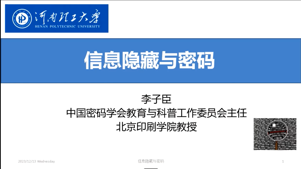 12月13日下午,北京印刷学院李子臣教授参加yl6809永利官网第四届研究生学术文化节,为该院师生线上作题为《信息隐藏与密码》的学术报告,闫玺玺老师主持报告会,部分教师和课题组研究生参加报告会。