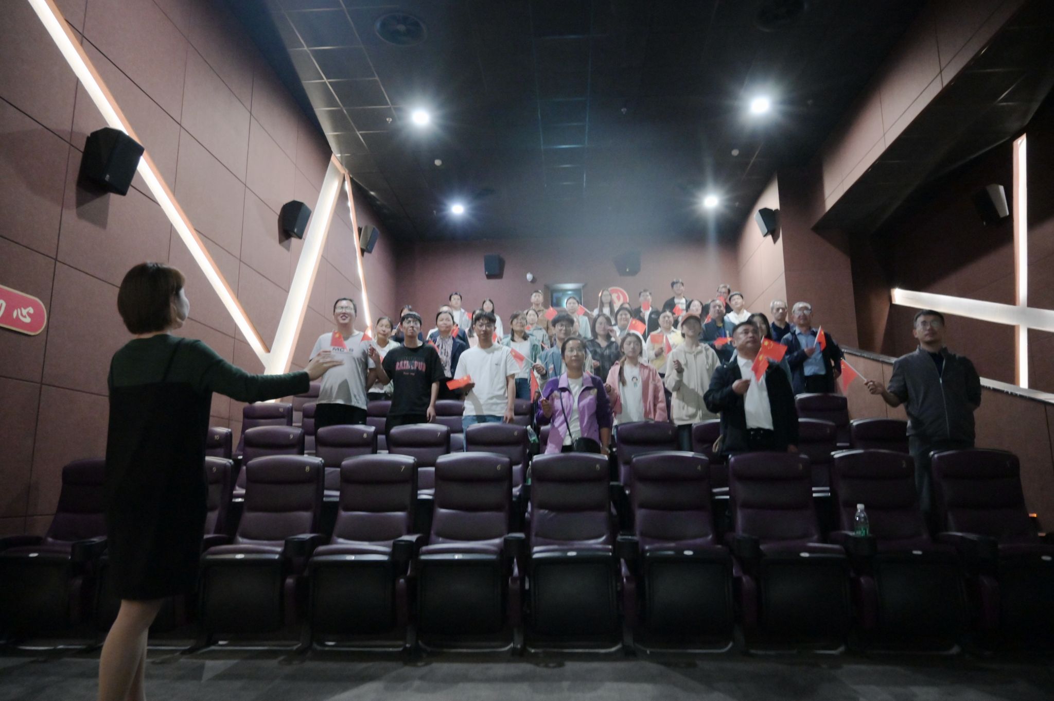 影片落幕之际,在带队老师的引领下,挥舞着手中的国旗,齐声高唱《我和我的祖国》。歌声嘹亮,情感澎湃,电影党课的气氛在这一刻达到了顶峰,浓烈的爱国主义情怀在每个人心中久久回荡。