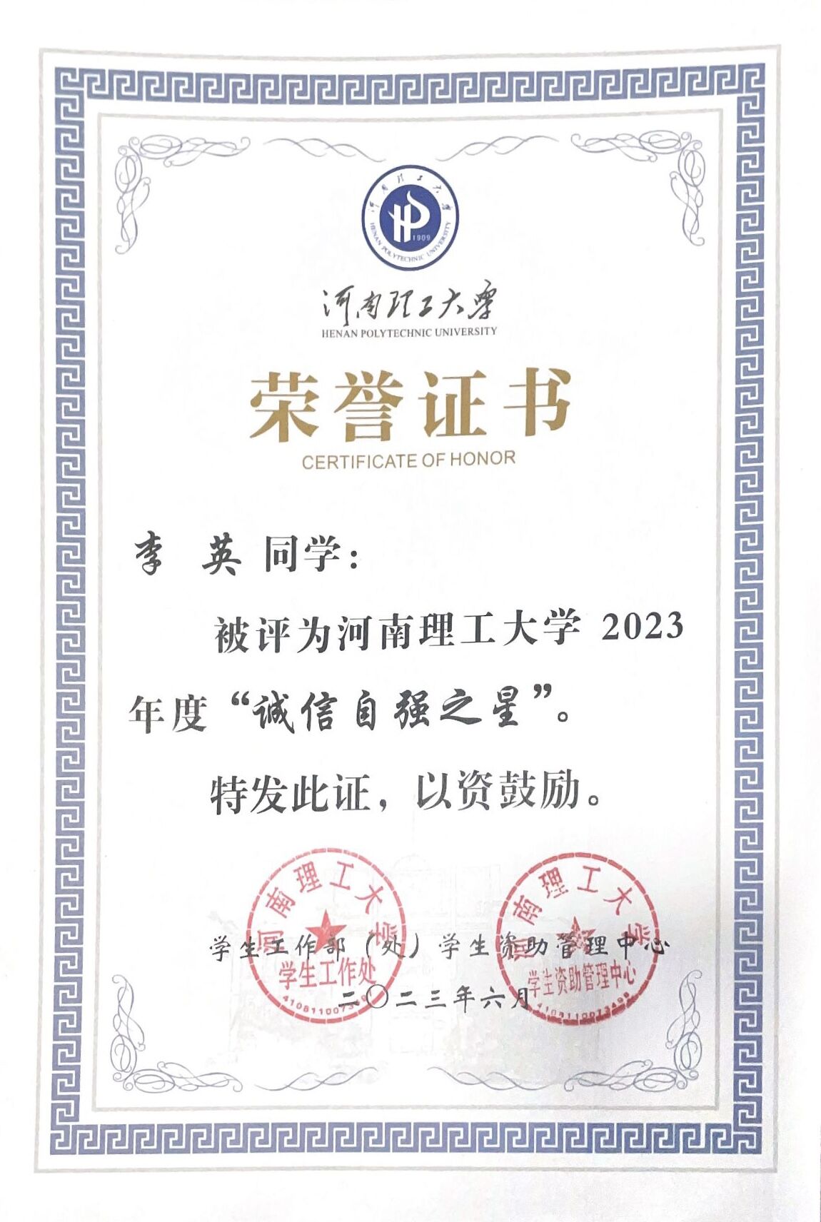 为增强大学生的诚信意识和责任意识,弘扬诚实守信、自强自立、感恩奉献的优良品质,鼓励受助学生励志成才、诚信还贷,近期,学校组织开展了2023年度“诚信自强之星”评选活动。我院2020级计算机科学与技术专业研究生李英获得河南理工大学2023年度“诚信自强之星”称号。