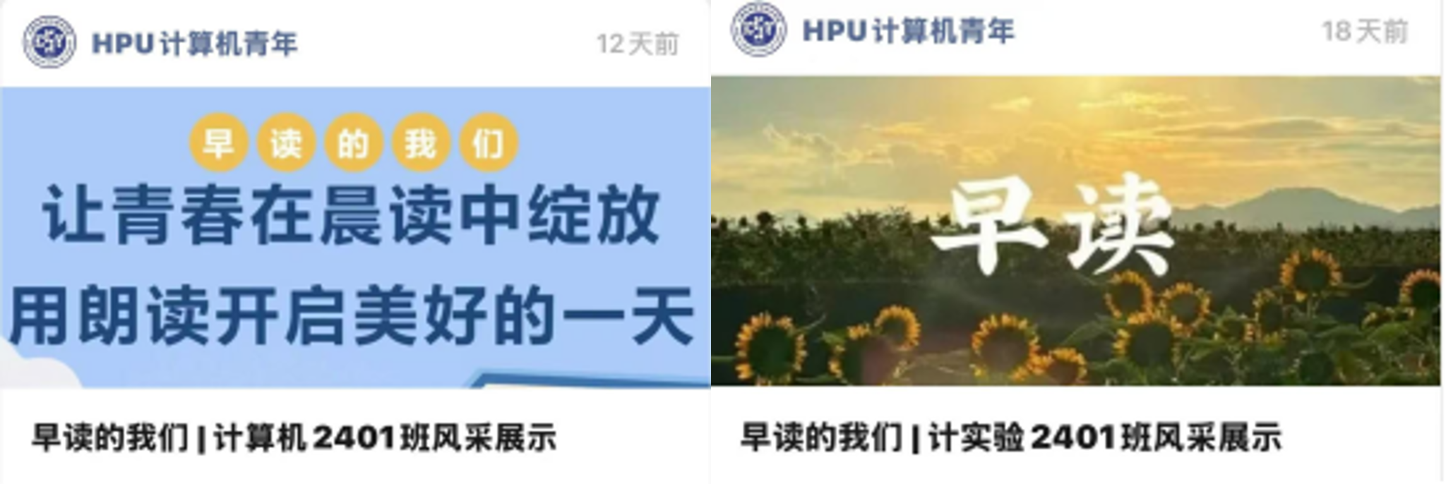 活动以班级为单位进行风采展示。各班级通过收集班级全体成员学生早读照片,配以对早读的认识、早读内容的分享和早读的体会,通过学院团委微信公众号进行展示。早读活动培养了同学们良好的学习习惯和自律能力,“早读的我们”风采展示全员参与,增强了班级的凝聚力,带动了个别学生克服困难参加早读的积极性。活动过程中,新生班主任也积极参与,轮流进行早读值班督导,为同学们解答学习中的疑难问题,传授学习技巧和方法,引导学生更好地规划学习路径。师生之间的互动交流,不仅增强了早读的学习效果,也拉近了师生间的距离。将通过HPU计算机青年公众号的展示,也让更多师生了解了学院学子积极向上、努力拼搏的精神风采,激励全体同学以更加饱满的热情投入学习中。