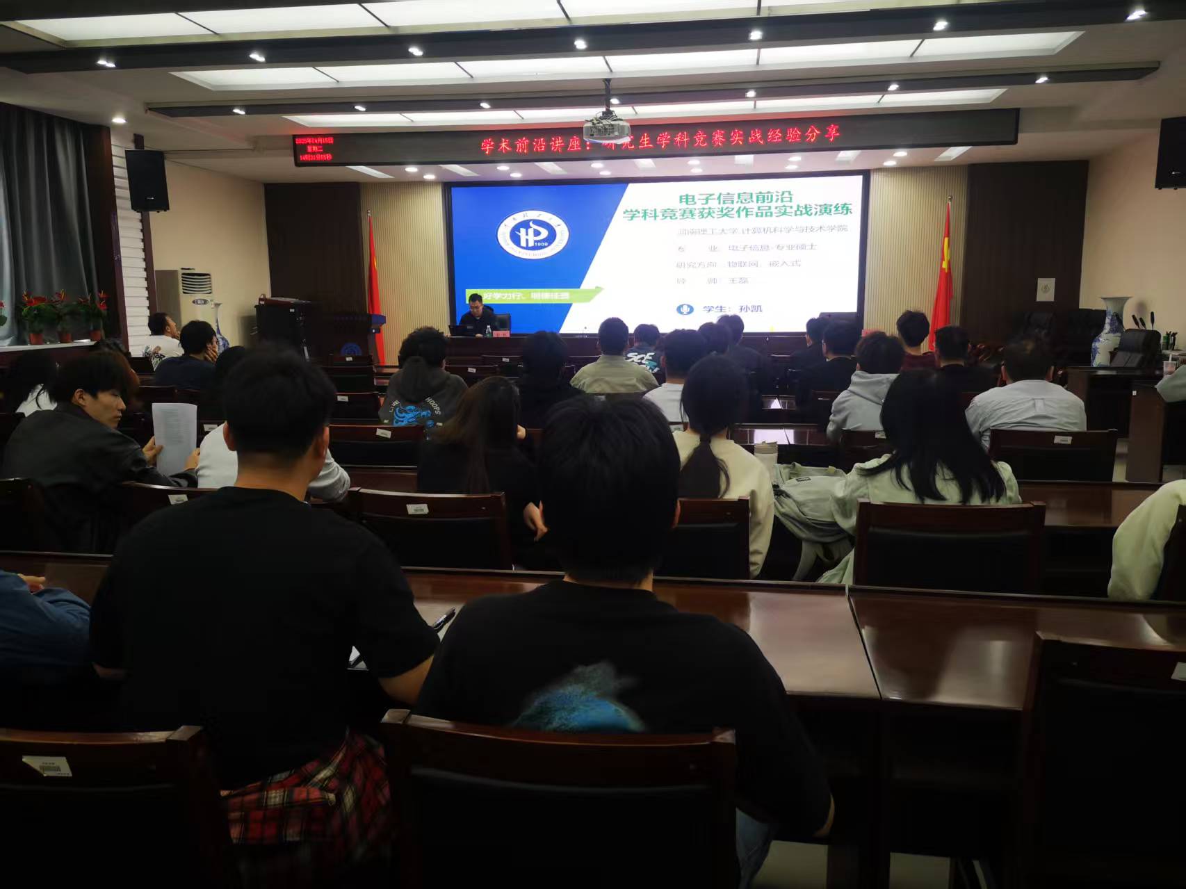 4月15日下午,我院在201会议室举办“研究生学科竞赛实战经验分享”学术前沿讲座。讲座特邀2022级孙凯、2023级王子豪两位国家级一等奖获得者进行学科竞赛实战经验分享。讲座由学院副院长于金霞主持,2024级电子信息专业硕士研究生及部分教师代表近60人参加。